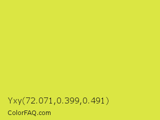 Yxy 72.071,0.399,0.491 Color is a normal yellow color and the nearest color is Maximum Green Yellow #d9e650. Hex code #dbe643 and RGB value is rgb(219,230,67). In RGB color space, this color is composed of 86% red, 90% green, 26% blue, In CMYK color space, this color is composed of 5% cyan, 0% magenta, 71% yellow , 10% black , In HSL color space, this color has a hue angle of 64° , 77% saturation and 58% lightness.