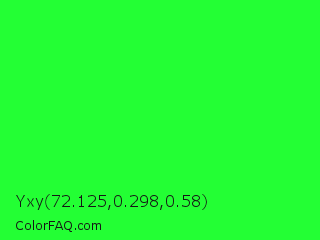 Yxy 72.125,0.298,0.58 Color is a normal green color and the nearest color is Neon Green #39ff14. Hex code #23ff34 and RGB value is rgb(35,255,52). In RGB color space, this color is composed of 14% red, 100% green, 20% blue, In CMYK color space, this color is composed of 86% cyan, 0% magenta, 80% yellow , 0% black , In HSL color space, this color has a hue angle of 125° , 100% saturation and 57% lightness.