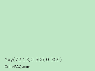 Yxy 72.13,0.306,0.369 Color is a very light green color and the nearest color is Madang #b7f0be. Hex code #bee7c5 and RGB value is rgb(190,231,197). In RGB color space, this color is composed of 75% red, 91% green, 77% blue, In CMYK color space, this color is composed of 18% cyan, 0% magenta, 15% yellow , 9% black , In HSL color space, this color has a hue angle of 130° , 46% saturation and 83% lightness.