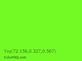 Yxy 72.156,0.327,0.567 Color is a normal green color and the nearest color is Spring Frost #87ff2a. Hex code #73fa25 and RGB value is rgb(115,250,37). In RGB color space, this color is composed of 45% red, 98% green, 15% blue, In CMYK color space, this color is composed of 54% cyan, 0% magenta, 85% yellow , 2% black , In HSL color space, this color has a hue angle of 98° , 96% saturation and 56% lightness.