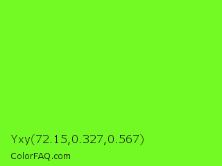 Yxy 72.15,0.327,0.567 Color is a normal green color and the nearest color is Spring Frost #87ff2a. Hex code #73fa25 and RGB value is rgb(115,250,37). In RGB color space, this color is composed of 45% red, 98% green, 15% blue, In CMYK color space, this color is composed of 54% cyan, 0% magenta, 85% yellow , 2% black , In HSL color space, this color has a hue angle of 98° , 96% saturation and 56% lightness.