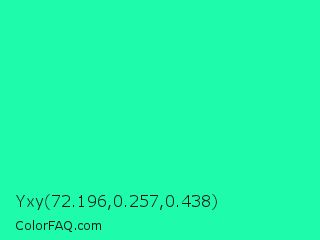 Yxy 72.196,0.257,0.438 Color is a normal green color and the nearest color is Medium Spring Green #00fa9a. Hex code #1dfbab and RGB value is rgb(29,251,171). In RGB color space, this color is composed of 11% red, 98% green, 67% blue, In CMYK color space, this color is composed of 88% cyan, 0% magenta, 32% yellow , 2% black , In HSL color space, this color has a hue angle of 158° , 97% saturation and 55% lightness.