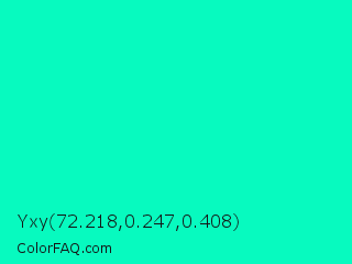 Yxy 72.218,0.247,0.408 Color is a normal cyan color and the nearest color is Bright Turquoise #08e8de. Hex code #07fabf and RGB value is rgb(7,250,191). In RGB color space, this color is composed of 3% red, 98% green, 75% blue, In CMYK color space, this color is composed of 97% cyan, 0% magenta, 24% yellow , 2% black , In HSL color space, this color has a hue angle of 165° , 96% saturation and 50% lightness.