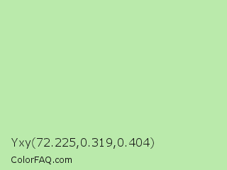Yxy 72.225,0.319,0.404 Color is a light green color and the nearest color is Celadon #ace1af. Hex code #baeaab and RGB value is rgb(186,234,171). In RGB color space, this color is composed of 73% red, 92% green, 67% blue, In CMYK color space, this color is composed of 21% cyan, 0% magenta, 27% yellow , 8% black , In HSL color space, this color has a hue angle of 106° , 60% saturation and 79% lightness.