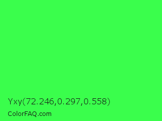 Yxy 72.246,0.297,0.558 Color is a light green color and the nearest color is Screamin Green #66ff66. Hex code #3afe4c and RGB value is rgb(58,254,76). In RGB color space, this color is composed of 23% red, 100% green, 30% blue, In CMYK color space, this color is composed of 77% cyan, 0% magenta, 70% yellow , 0% black , In HSL color space, this color has a hue angle of 126° , 99% saturation and 61% lightness.