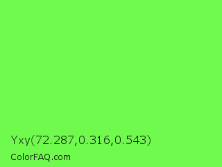 Yxy 72.287,0.316,0.543 Color is a light green color and the nearest color is Screamin Green #66ff66. Hex code #6ffa4d and RGB value is rgb(111,250,77). In RGB color space, this color is composed of 44% red, 98% green, 30% blue, In CMYK color space, this color is composed of 56% cyan, 0% magenta, 69% yellow , 2% black , In HSL color space, this color has a hue angle of 108° , 95% saturation and 64% lightness.