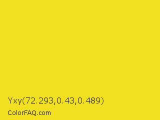 Yxy 72.293,0.43,0.489 Color is a normal yellow color and the nearest color is Ripe Lemon #f4d81c. Hex code #f2e020 and RGB value is rgb(242,224,32). In RGB color space, this color is composed of 95% red, 88% green, 13% blue, In CMYK color space, this color is composed of 0% cyan, 7% magenta, 87% yellow , 5% black , In HSL color space, this color has a hue angle of 55° , 89% saturation and 54% lightness.