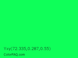 Yxy 72.335,0.287,0.55 Color is a normal green color and the nearest color is Malachite #0bda51. Hex code #0eff59 and RGB value is rgb(14,255,89). In RGB color space, this color is composed of 5% red, 100% green, 35% blue, In CMYK color space, this color is composed of 95% cyan, 0% magenta, 65% yellow , 0% black , In HSL color space, this color has a hue angle of 139° , 100% saturation and 53% lightness.