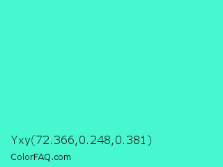 Yxy 72.366,0.248,0.381 Color is a light cyan color and the nearest color is Turquoise #40e0d0. Hex code #47f7cf and RGB value is rgb(71,247,207). In RGB color space, this color is composed of 28% red, 97% green, 81% blue, In CMYK color space, this color is composed of 71% cyan, 0% magenta, 16% yellow , 3% black , In HSL color space, this color has a hue angle of 166° , 92% saturation and 62% lightness.