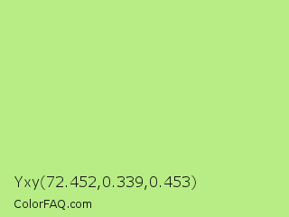 Yxy 72.452,0.339,0.453 Color is a light green color and the nearest color is Sulu #c1f07c. Hex code #b8ed85 and RGB value is rgb(184,237,133). In RGB color space, this color is composed of 72% red, 93% green, 52% blue, In CMYK color space, this color is composed of 22% cyan, 0% magenta, 44% yellow , 7% black , In HSL color space, this color has a hue angle of 91° , 74% saturation and 73% lightness.