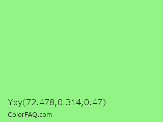 Yxy 72.478,0.314,0.47 Color is a light green color and the nearest color is Light Green #90ee90. Hex code #92f484 and RGB value is rgb(146,244,132). In RGB color space, this color is composed of 57% red, 96% green, 52% blue, In CMYK color space, this color is composed of 40% cyan, 0% magenta, 46% yellow , 4% black , In HSL color space, this color has a hue angle of 113° , 84% saturation and 74% lightness.