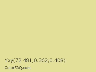Yxy 72.481,0.362,0.408 Color is a light yellow color and the nearest color is Zombie #e4d69b. Hex code #e3e199 and RGB value is rgb(227,225,153). In RGB color space, this color is composed of 89% red, 88% green, 60% blue, In CMYK color space, this color is composed of 0% cyan, 1% magenta, 33% yellow , 11% black , In HSL color space, this color has a hue angle of 58° , 57% saturation and 75% lightness.