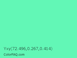 Yxy 72.496,0.267,0.414 Color is a light green color and the nearest color is Medium Aquamarine #66ddaa. Hex code #62f7b6 and RGB value is rgb(98,247,182). In RGB color space, this color is composed of 38% red, 97% green, 71% blue, In CMYK color space, this color is composed of 60% cyan, 0% magenta, 26% yellow , 3% black , In HSL color space, this color has a hue angle of 154° , 90% saturation and 68% lightness.