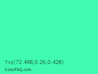 Yxy 72.498,0.26,0.428 Color is a light green color and the nearest color is Eucalyptus #44d7a8. Hex code #3ffab0 and RGB value is rgb(63,250,176). In RGB color space, this color is composed of 25% red, 98% green, 69% blue, In CMYK color space, this color is composed of 75% cyan, 0% magenta, 30% yellow , 2% black , In HSL color space, this color has a hue angle of 156° , 95% saturation and 61% lightness.