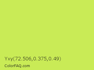 Yxy 72.506,0.375,0.49 Color is a light lime color and the nearest color is Maximum Green Yellow #d9e650. Hex code #c9eb56 and RGB value is rgb(201,235,86). In RGB color space, this color is composed of 79% red, 92% green, 34% blue, In CMYK color space, this color is composed of 14% cyan, 0% magenta, 63% yellow , 8% black , In HSL color space, this color has a hue angle of 74° , 79% saturation and 63% lightness.