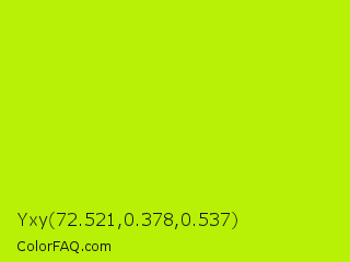 Yxy 72.521,0.378,0.537 Color is a normal lime color and the nearest color is Lime #bfff00. Hex code #b8f006 and RGB value is rgb(184,240,6). In RGB color space, this color is composed of 72% red, 94% green, 2% blue, In CMYK color space, this color is composed of 23% cyan, 0% magenta, 98% yellow , 6% black , In HSL color space, this color has a hue angle of 74° , 95% saturation and 48% lightness.