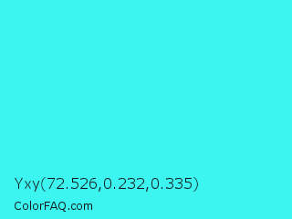 Yxy 72.526,0.232,0.335 Color is a normal cyan color and the nearest color is Turquoise #40e0d0. Hex code #3cf5f0 and RGB value is rgb(60,245,240). In RGB color space, this color is composed of 24% red, 96% green, 94% blue, In CMYK color space, this color is composed of 76% cyan, 0% magenta, 2% yellow , 4% black , In HSL color space, this color has a hue angle of 178° , 90% saturation and 60% lightness.
