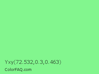 Yxy 72.532,0.3,0.463 Color is a light green color and the nearest color is Light Green #90ee90. Hex code #82f68e and RGB value is rgb(130,246,142). In RGB color space, this color is composed of 51% red, 96% green, 56% blue, In CMYK color space, this color is composed of 47% cyan, 0% magenta, 42% yellow , 4% black , In HSL color space, this color has a hue angle of 126° , 87% saturation and 74% lightness.