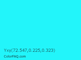 Yxy 72.547,0.225,0.323 Color is a normal cyan color and the nearest color is Loeen #15f2fd. Hex code #22f5fa and RGB value is rgb(34,245,250). In RGB color space, this color is composed of 13% red, 96% green, 98% blue, In CMYK color space, this color is composed of 86% cyan, 2% magenta, 0% yellow , 2% black , In HSL color space, this color has a hue angle of 181° , 96% saturation and 56% lightness.