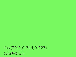 Yxy 72.5,0.314,0.523 Color is a light green color and the nearest color is Screamin Green #66ff66. Hex code #77f95f and RGB value is rgb(119,249,95). In RGB color space, this color is composed of 47% red, 98% green, 37% blue, In CMYK color space, this color is composed of 52% cyan, 0% magenta, 62% yellow , 2% black , In HSL color space, this color has a hue angle of 111° , 93% saturation and 67% lightness.