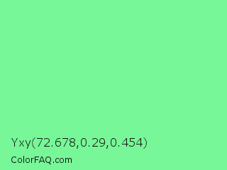 Yxy 72.678,0.29,0.454 Color is a light green color and the nearest color is Light Green #90ee90. Hex code #77f797 and RGB value is rgb(119,247,151). In RGB color space, this color is composed of 47% red, 97% green, 59% blue, In CMYK color space, this color is composed of 52% cyan, 0% magenta, 39% yellow , 3% black , In HSL color space, this color has a hue angle of 135° , 89% saturation and 72% lightness.