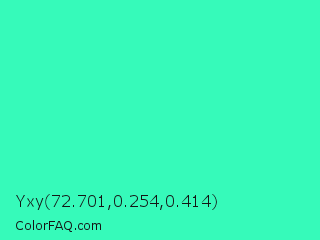 Yxy 72.701,0.254,0.414 Color is a normal green color and the nearest color is Turquoise #40e0d0. Hex code #36faba and RGB value is rgb(54,250,186). In RGB color space, this color is composed of 21% red, 98% green, 73% blue, In CMYK color space, this color is composed of 78% cyan, 0% magenta, 26% yellow , 2% black , In HSL color space, this color has a hue angle of 160° , 95% saturation and 60% lightness.