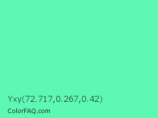 Yxy 72.717,0.267,0.42 Color is a light green color and the nearest color is Medium Aquamarine #66ddaa. Hex code #5df8b3 and RGB value is rgb(93,248,179). In RGB color space, this color is composed of 36% red, 97% green, 70% blue, In CMYK color space, this color is composed of 63% cyan, 0% magenta, 28% yellow , 3% black , In HSL color space, this color has a hue angle of 153° , 92% saturation and 67% lightness.