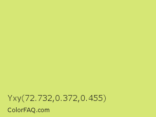 Yxy 72.732,0.372,0.455 Color is a light yellow color and the nearest color is Booger Buster #dde26a. Hex code #d6e775 and RGB value is rgb(214,231,117). In RGB color space, this color is composed of 84% red, 91% green, 46% blue, In CMYK color space, this color is composed of 7% cyan, 0% magenta, 49% yellow , 9% black , In HSL color space, this color has a hue angle of 69° , 70% saturation and 68% lightness.
