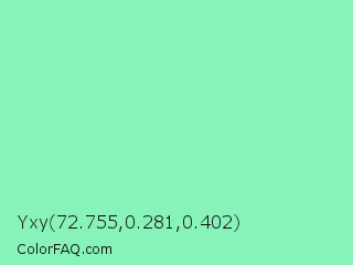 Yxy 72.755,0.281,0.402 Color is a light green color and the nearest color is Teal Deer #99e6b3. Hex code #87f3b9 and RGB value is rgb(135,243,185). In RGB color space, this color is composed of 53% red, 95% green, 73% blue, In CMYK color space, this color is composed of 44% cyan, 0% magenta, 24% yellow , 5% black , In HSL color space, this color has a hue angle of 148° , 82% saturation and 74% lightness.