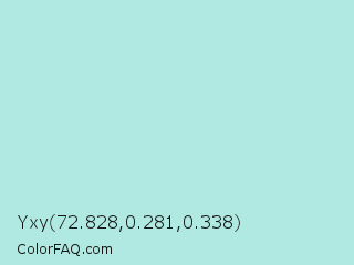 Yxy 72.828,0.281,0.338 Color is a light cyan color and the nearest color is Cruise #b5ecdf. Hex code #b0e9e1 and RGB value is rgb(176,233,225). In RGB color space, this color is composed of 69% red, 91% green, 88% blue, In CMYK color space, this color is composed of 24% cyan, 0% magenta, 3% yellow , 9% black , In HSL color space, this color has a hue angle of 172° , 56% saturation and 80% lightness.