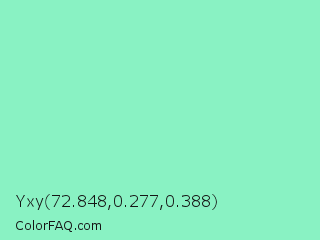 Yxy 72.848,0.277,0.388 Color is a light green color and the nearest color is Aquamarine #7fffd4. Hex code #89f2c3 and RGB value is rgb(137,242,195). In RGB color space, this color is composed of 54% red, 95% green, 76% blue, In CMYK color space, this color is composed of 43% cyan, 0% magenta, 19% yellow , 5% black , In HSL color space, this color has a hue angle of 153° , 80% saturation and 74% lightness.