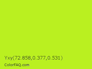 Yxy 72.858,0.377,0.531 Color is a normal lime color and the nearest color is Inch Worm #b0e313. Hex code #baf01f and RGB value is rgb(186,240,31). In RGB color space, this color is composed of 73% red, 94% green, 12% blue, In CMYK color space, this color is composed of 23% cyan, 0% magenta, 87% yellow , 6% black , In HSL color space, this color has a hue angle of 76° , 87% saturation and 53% lightness.