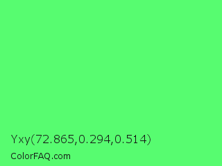 Yxy 72.865,0.294,0.514 Color is a light green color and the nearest color is Screamin Green #66ff66. Hex code #57fc70 and RGB value is rgb(87,252,112). In RGB color space, this color is composed of 34% red, 99% green, 44% blue, In CMYK color space, this color is composed of 65% cyan, 0% magenta, 56% yellow , 1% black , In HSL color space, this color has a hue angle of 129° , 96% saturation and 66% lightness.