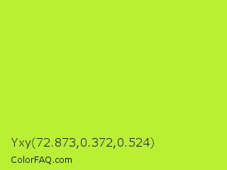 Yxy 72.873,0.372,0.524 Color is a normal lime color and the nearest color is Green Lizard #a7f432. Hex code #b9f033 and RGB value is rgb(185,240,51). In RGB color space, this color is composed of 73% red, 94% green, 20% blue, In CMYK color space, this color is composed of 23% cyan, 0% magenta, 79% yellow , 6% black , In HSL color space, this color has a hue angle of 77° , 86% saturation and 57% lightness.
