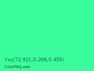 Yxy 72.921,0.268,0.459 Color is a light green color and the nearest color is Eucalyptus #44d7a8. Hex code #3afc9c and RGB value is rgb(58,252,156). In RGB color space, this color is composed of 23% red, 99% green, 61% blue, In CMYK color space, this color is composed of 77% cyan, 0% magenta, 38% yellow , 1% black , In HSL color space, this color has a hue angle of 150° , 97% saturation and 61% lightness.
