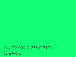 Yxy 72.924,0.278,0.517 Color is a normal green color and the nearest color is Spring Green #00ff7f. Hex code #11ff75 and RGB value is rgb(17,255,117). In RGB color space, this color is composed of 7% red, 100% green, 46% blue, In CMYK color space, this color is composed of 93% cyan, 0% magenta, 54% yellow , 0% black , In HSL color space, this color has a hue angle of 145° , 100% saturation and 53% lightness.