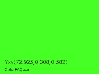 Yxy 72.925,0.308,0.582 Color is a normal green color and the nearest color is Neon Green #39ff14. Hex code #46ff25 and RGB value is rgb(70,255,37). In RGB color space, this color is composed of 27% red, 100% green, 15% blue, In CMYK color space, this color is composed of 73% cyan, 0% magenta, 85% yellow , 0% black , In HSL color space, this color has a hue angle of 111° , 100% saturation and 57% lightness.