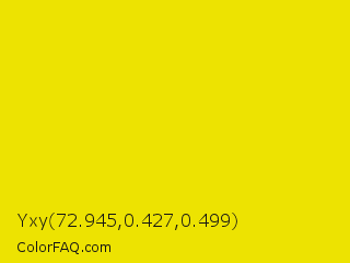 Yxy 72.945,0.427,0.499 Color is a normal yellow color and the nearest color is Titanium Yellow #eee600. Hex code #ede301 and RGB value is rgb(237,227,1). In RGB color space, this color is composed of 93% red, 89% green, 0% blue, In CMYK color space, this color is composed of 0% cyan, 4% magenta, 100% yellow , 7% black , In HSL color space, this color has a hue angle of 57° , 99% saturation and 47% lightness.