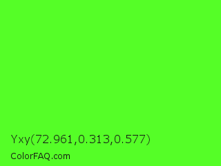 Yxy 72.961,0.313,0.577 Color is a normal green color and the nearest color is Neon Green #39ff14. Hex code #55fe27 and RGB value is rgb(85,254,39). In RGB color space, this color is composed of 33% red, 100% green, 15% blue, In CMYK color space, this color is composed of 67% cyan, 0% magenta, 85% yellow , 0% black , In HSL color space, this color has a hue angle of 107° , 99% saturation and 57% lightness.