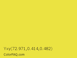 Yxy 72.971,0.414,0.482 Color is a normal yellow color and the nearest color is Sandstorm #ecd540. Hex code #ebe341 and RGB value is rgb(235,227,65). In RGB color space, this color is composed of 92% red, 89% green, 25% blue, In CMYK color space, this color is composed of 0% cyan, 3% magenta, 72% yellow , 8% black , In HSL color space, this color has a hue angle of 57° , 81% saturation and 59% lightness.