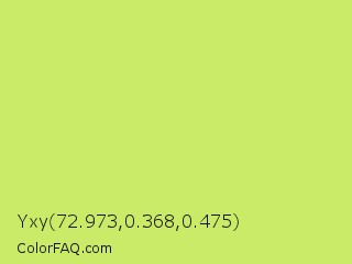 Yxy 72.973,0.368,0.475 Color is a light lime color and the nearest color is Booger Buster #dde26a. Hex code #caeb68 and RGB value is rgb(202,235,104). In RGB color space, this color is composed of 79% red, 92% green, 41% blue, In CMYK color space, this color is composed of 14% cyan, 0% magenta, 56% yellow , 8% black , In HSL color space, this color has a hue angle of 75° , 77% saturation and 66% lightness.
