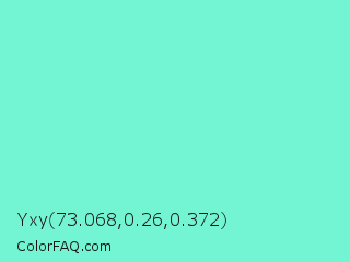 Yxy 73.068,0.26,0.372 Color is a light cyan color and the nearest color is Aquamarine #7fffd4. Hex code #73f4d2 and RGB value is rgb(115,244,210). In RGB color space, this color is composed of 45% red, 96% green, 82% blue, In CMYK color space, this color is composed of 53% cyan, 0% magenta, 14% yellow , 4% black , In HSL color space, this color has a hue angle of 164° , 85% saturation and 70% lightness.