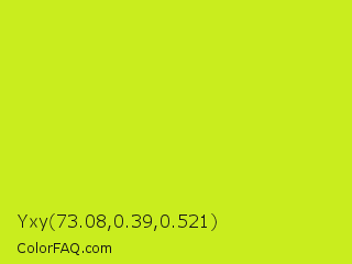 Yxy 73.08,0.39,0.521 Color is a normal yellow color and the nearest color is Las Palmas #c6e610. Hex code #c9ed1e and RGB value is rgb(201,237,30). In RGB color space, this color is composed of 79% red, 93% green, 12% blue, In CMYK color space, this color is composed of 15% cyan, 0% magenta, 87% yellow , 7% black , In HSL color space, this color has a hue angle of 70° , 85% saturation and 52% lightness.