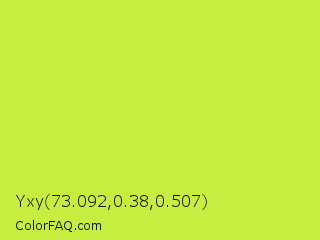 Yxy 73.092,0.38,0.507 Color is a normal lime color and the nearest color is Pear #d1e231. Hex code #c7ed41 and RGB value is rgb(199,237,65). In RGB color space, this color is composed of 78% red, 93% green, 25% blue, In CMYK color space, this color is composed of 16% cyan, 0% magenta, 73% yellow , 7% black , In HSL color space, this color has a hue angle of 73° , 83% saturation and 59% lightness.