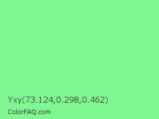Yxy 73.124,0.298,0.462 Color is a light green color and the nearest color is Light Green #90ee90. Hex code #80f790 and RGB value is rgb(128,247,144). In RGB color space, this color is composed of 50% red, 97% green, 56% blue, In CMYK color space, this color is composed of 48% cyan, 0% magenta, 42% yellow , 3% black , In HSL color space, this color has a hue angle of 128° , 88% saturation and 74% lightness.