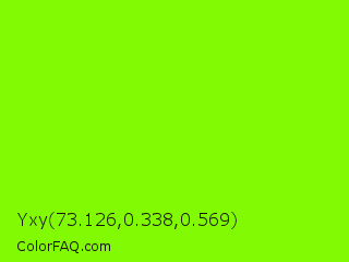 Yxy 73.126,0.338,0.569 Color is a normal green color and the nearest color is Chartreuse #7fff00. Hex code #82fa04 and RGB value is rgb(130,250,4). In RGB color space, this color is composed of 51% red, 98% green, 2% blue, In CMYK color space, this color is composed of 48% cyan, 0% magenta, 98% yellow , 2% black , In HSL color space, this color has a hue angle of 89° , 97% saturation and 50% lightness.