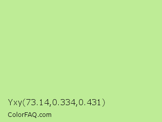 Yxy 73.14,0.334,0.431 Color is a light green color and the nearest color is Medium Spring Bud #c9dc87. Hex code #beec96 and RGB value is rgb(190,236,150). In RGB color space, this color is composed of 75% red, 93% green, 59% blue, In CMYK color space, this color is composed of 19% cyan, 0% magenta, 36% yellow , 7% black , In HSL color space, this color has a hue angle of 92° , 69% saturation and 76% lightness.