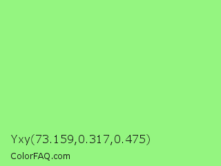 Yxy 73.159,0.317,0.475 Color is a light green color and the nearest color is Light Green #90ee90. Hex code #94f580 and RGB value is rgb(148,245,128). In RGB color space, this color is composed of 58% red, 96% green, 50% blue, In CMYK color space, this color is composed of 40% cyan, 0% magenta, 48% yellow , 4% black , In HSL color space, this color has a hue angle of 110° , 85% saturation and 73% lightness.