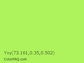 Yxy 73.161,0.35,0.502 Color is a light green color and the nearest color is Inchworm #b2ec5d. Hex code #aef25c and RGB value is rgb(174,242,92). In RGB color space, this color is composed of 68% red, 95% green, 36% blue, In CMYK color space, this color is composed of 28% cyan, 0% magenta, 62% yellow , 5% black , In HSL color space, this color has a hue angle of 87° , 85% saturation and 65% lightness.