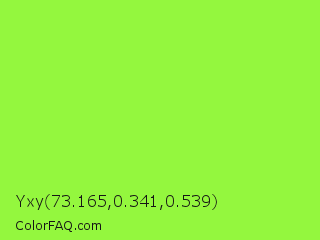 Yxy 73.165,0.341,0.539 Color is a light green color and the nearest color is French Lime #9efd38. Hex code #94f73e and RGB value is rgb(148,247,62). In RGB color space, this color is composed of 58% red, 97% green, 24% blue, In CMYK color space, this color is composed of 40% cyan, 0% magenta, 75% yellow , 3% black , In HSL color space, this color has a hue angle of 92° , 92% saturation and 61% lightness.